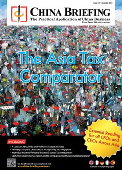Nov. 30 – The new issue of China Briefing Magazine, titled The Asia Tax Comparator, is out now and will be temporarily available as a complimentary PDF download on the Asia Briefing Bookstore throughout the month of December. This month’s issue also offers our new 2013 Asia Tax Guide as a complimentary supplement, providing an overview of corporate and individual income tax rates for key countries in emerging Asia.