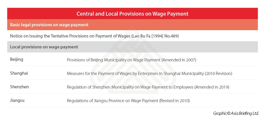 Il documento Lao Bu Fa [1994] No.489 ha dichiarato che gli stipendi devono essere pagati almeno una volta al mese. In altre parole, normalmente il periodo massimo di pagamento delle retribuzioni è di un mese. Su questa base, i legislatori locali hanno formulato disposizioni regionali sul ciclo di pagamento dei salari, che indicano regole relative al differimento dei pagamenti. Confrontando le province locali di Pechino, Shanghai, Shenzhen e Jiangsu, abbiamo trovato sia punti comuni che discrepanze.