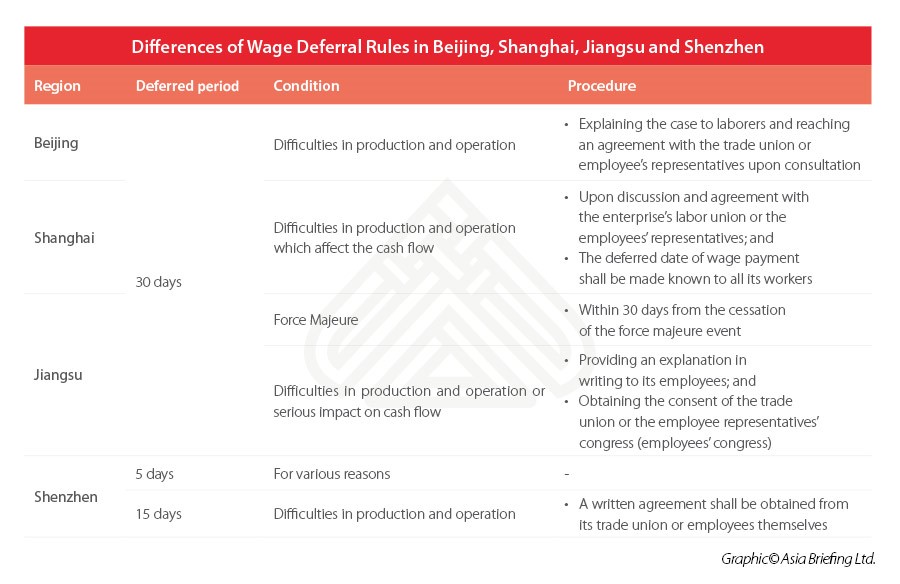 - Allo stesso modo, nell’identificazione delle “ragioni” per il pagamento ritardato (nel regolamento di Shenzhen sul pagamento degli stipendi ai dipendenti) o del “(grave) impatto sulla liquidità” (nei regolamenti di Suzhou e Shanghai), i datori di lavoro devono tenere conto delle pratiche locali.