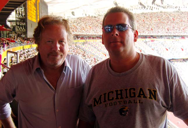 Chris Devonshire-Ellis (left), senior partner of Dezan Shira & Associates, and Arnie Jensen (right), president and COO of Asimco, enjoying track and field events at Dezan Shira’s corporate box at the Bird’s Nest.