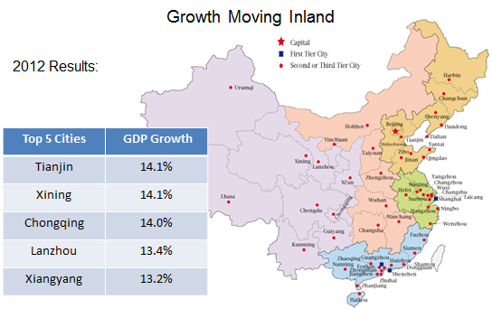 However, there is higher growth elsewhere in China. Once we move inland, Chinas cities start to show figures at rates of 8 percent and above. Consider the following from 2012: