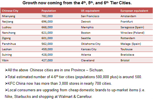 This is not an overnight phenomenon. In fact many MNCs have seen this coming for several years, and already have supply chains and outlets across China. KFC for example, now operate over 3,000 stores in over 700 cities in China. McDonald’s has a similar pattern, as does Starbucks. What is happening is that while the number of consumers in cities such as Lanzhou that can afford to buy a Cartier watch may not be as many as in Shanghai, they are instead upgrading their life styles in other ways, such as switching from a glass of green tea to a Starbucks latte. Instead of wearing cheap canvas pumps, people are upgrading to a pair of Nikes, or changing their pants for a new pair of Levis. This is the new level of Chinese consumerism, and this is where China’s future growth dynamic is coming from.