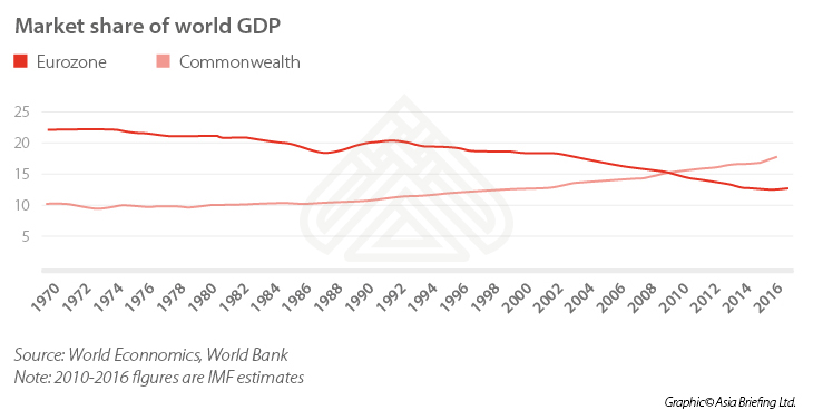 The graphic below shows the estimated population trends for the Eurozone compared with the Commonwealth for the 2016-2050 period. As can be seen, population growth in the Commonwealth alone is expected to rise by over 30 percent for this period, whereas the Eurozone population is expected to fall by 1.9 percent.