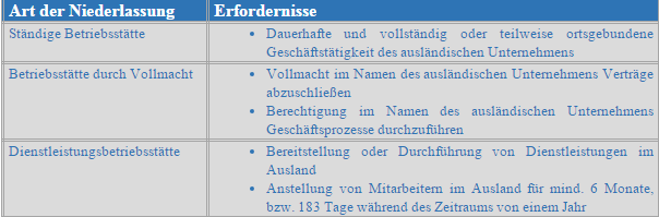Die Betriebsstätte (engl. Permanent Establishment (PE)) – definiert als der dauerhafte Ort der Geschäftstätigkeit in einem Land – ist ein Schlüsselkonzept für die praktische Anwendbarkeit eines Doppelbesteuerungsabkommens. Wenn ein ausländisches Unternehmen (in Bezug auf China) seinen Steuersitz in einem Rechtsystem mit Doppelbesteuerungsabkommen mit China hat, kann es gegebenenfalls eine Befreiung der Körperschaftsteuer beantragen, solange die Niederlassungen in China gemäß des entsprechenden Artikels des DTAs nicht in die Kategorie der Betriebsstätte in China fallen.