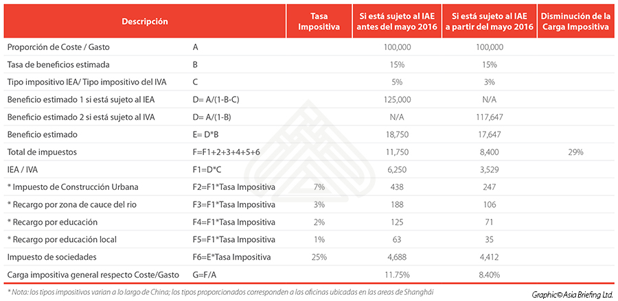 En la tabla siguiente hemos resumido todas las ecuaciones generales que son utilizadas en el cálculo de los impuestos de las OR, así como una breve demostración del cambio en la fiscalidad basado en un supuesto de los profesionales en derecho tributario de Dezan Shira & Associates. El método del Gasto-plus es el utilizado para describir de forma más clara la disminución general de la carga impositiva sobre las OR.