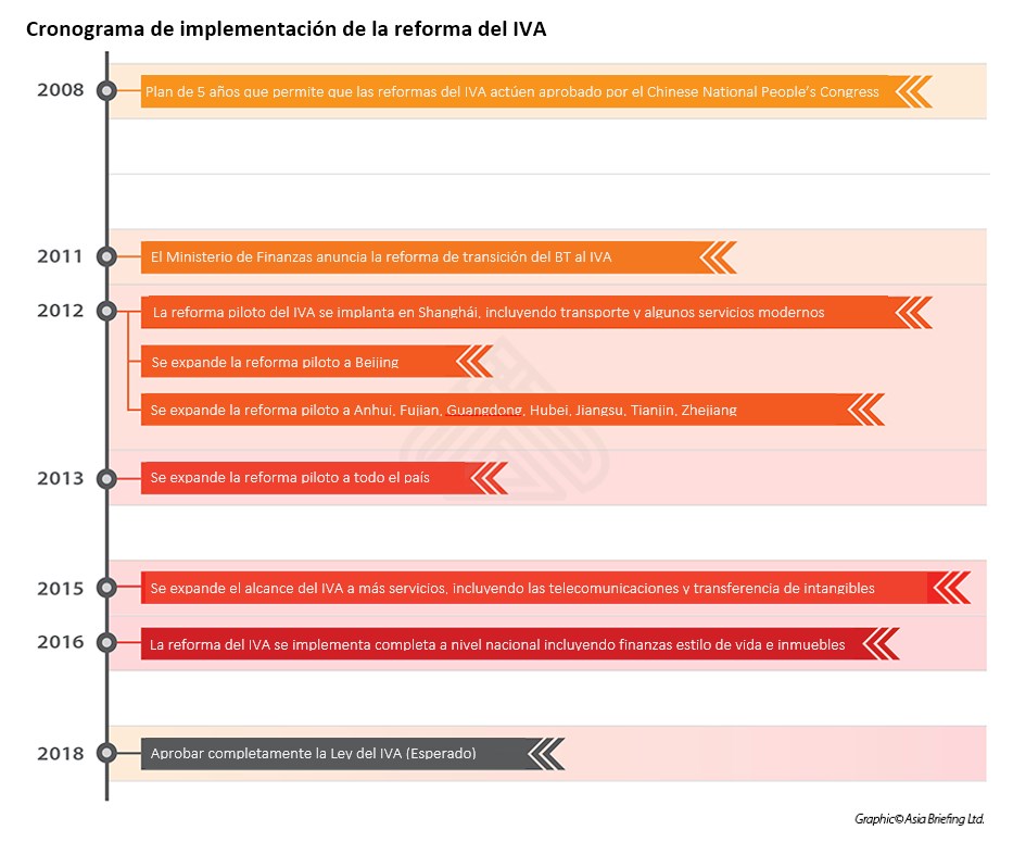La última fase de las reformas del IVA, se introdujo primero como proyecto piloto en Shanghái en 2012, incorporando industrias como ciertos transportes y servicios modernos, antes de ser expandido a otras regiones en el mismo año y eventualmente ser extendido a nivel nacional el 1 de Agosto del 2013. A finales de 2015, los servicios modernos, servicios postales, servicios de telecomunicaciones y servicios de transporte fueren incluidos totalmente en el régimen de IVA a nivel nacional. El Ministerio de Finanzas y la Administración de Impuestos del Estado publicaron conjuntamente el Caishui [2016] No. 36 (Circular 36) el 23 de Marzo de 2016, la cual proclama que los principales sectores que aún pagan el BT transicionarán al régimen de IVA. Efectivo a partir del 1 de Mayo de 2016, los sectores de la construcción, finanzas, moda, inmobiliario, adoptarán el IVA, esencialmente eliminando el BT del sistema de impuestos chino.