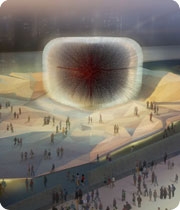 The Seed Cathedral sits on top of a 6,000 square meter landscape that resembles unfolded wrapping paper, which symbolizes the pavilion’s role as a gift from the United Kingdom to China. Inside visitors will move through three walkways. The first presents the modern British urban landscape, including the history of its development. The visitor will travel through models of the U.K. capitals of Belfast, Cardiff, Edinburgh, and London, which highlight their many public parks. On the second walkway, visitors will see a model of a typical British city suspended from the ceiling, which illustrates how cities in Britain embrace nature. The final walkway features a river of imaginary and real plants, which challenges the spectator to imagine urban life that harnesses the power of nature and technology.