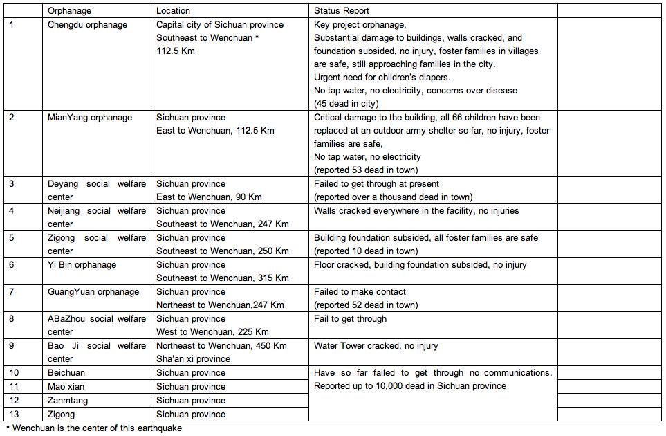 We know that Mianyang orphanage has been destroyed and many of the families are unaccounted for.1000 students and teachers have been buried when the main building of the Beichuan county middle school was reduced to rubble no news of the orphanage or foster families, four schools have collapsed in Deyang City also no news of the orphanage and families.