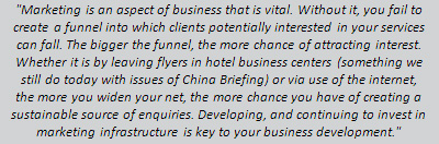 Of course, I couldn’t bring clients home for a meeting. But I could see them in their hotels. So meetings were always conducted in their hotels, meeting in the lobby over a coffee. Although I had a set program of services that I was providing – mainly legal administration work related to setting up representative offices, trademarks, and so on – I would also be asked if I could perform other duties such as market research, recruitment and even teach English to an entire Chinese management team twice a week for a year. Beggars can’t be choosers, and sometimes it is necessary to bill for related, yet non-core work during the early days.