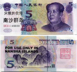 The Spratly Islands are a group of more than 100 small islands and reefs in the South China Sea. The islands, which are claimed in whole or in part by China, Taiwan, Vietnam, Philippines, Malaysia and Brunei, sit atop potentially large oil and gas deposits, are surrounded by rich fishing grounds and are located on major shipping lanes. Various islands are occupied from time to time by fisherman, military forces of the various claimants and oil exploration crews. China calls the islands the Nansha Islands and bases their claim on fact that some old Chinese coins and pottery have been found there. Recently some banknotes have appeared that re-enforces their claim on the islands. They are current, regular issue Chinese Jiao and Yuan notes that are overprinted in English on the reverse and Chinese on the obverse “FOR USE ONLY IN NANSHA ISLANDS”. Each of the notes also bears a large red chop that refers to the South China Sea Fleet – a division of the Chinese Navy.