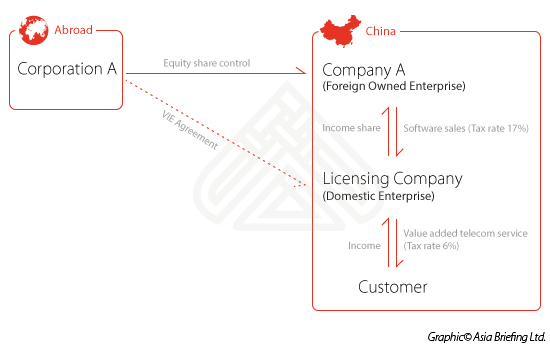 Um diese Beschränkungen zu umgehen, berechtigt der ausländische Investor, Aktionäre chinesischer Nationalität, damit diese eine inländische Lizenzgesellschaft in China gründen können. Diese befähigt das WFOE zur Kontrolle über Betrieb und Gewinnverteilung der Lizenzgesellschaft. Entsprechend dem vom WFOE und der Lizenzgesellschaft unterzeichneten Vertrag, ist das WFOE zuständig für die Softwareentwicklung und Marketingdienstleistungen (z.B. Bereitstellung des Produkts für die VATS-Dienstleistungen der Lizenzgesellschaft), während die Lizenzgesellschaft die Betriebsplattform der VATS bereitstellt. Von der Lizenzgesellschaft erwirtschaftete Gewinne werden dem vereinbarten Verhältnis entsprechend aufgeteilt, wobei über 70 Prozent an das WFOE gehen.