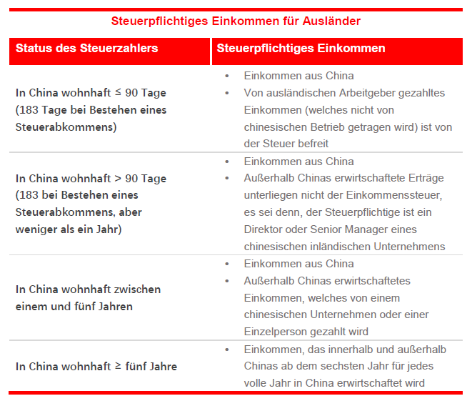 Derzeit unterliegen ausländische Personen, die sich länger als ein Jahr, aber weniger als fünf Jahre in China aufhalten, der Steuer auf ihr in China erwirtschaftetes Einkommen und ihr Einkommen außerhalb Chinas (von einer chinesischen Körperschaft oder Person).
