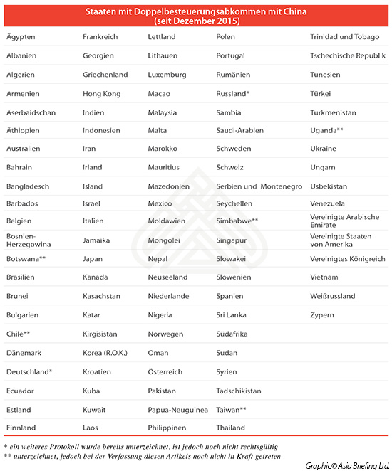 Einkünfte von ausländische Unternehmen oder Einzelpersonen in China können sowohl der chinesischen als auch der Steuerpflicht in ihren Heimatländern unterliegen. Somit ergibt sich im Wesentlichen die Erhöhung ihrer Steuerbelastung. Daher entscheiden sich viele Investoren für die Gründung von einer Gesellschaft in Ländern, die ein Abkommen zur Vermeidung der Doppelbesteuerung (DBAs) mit China haben, um reduzierte Steuersätze in Anspruch nehmen zu können. Jedoch ist das Antragsverfahren für Steuervorteile noch sehr kompliziert und aufwendig.