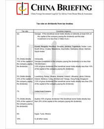 According to the new law, from January 1, 2008, 10 percent of withholding tax shall be applied to the dividends that a non-resident company receives from a resident company, unless otherwise prescribed in the tax treaty with the relevant foreign government. If the rate in the tax treaty is higher than 10 percent, 10 percent of dividends shall be adopted according to current rules; if the rate in the tax treaty is lower than 10 percent, the rate in the tax treaty should be adopted.