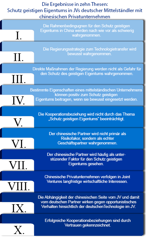 Auch bei einem erfolgreichen Start der Kooperation und späteren Erfolgen sollte man seinen Scharfsinn bewahren und den Partner als eigenständigen ökonomischen Akteur ernst nehmen. Der Partner richtet sein Verhalten nach seinen eigenen wirtschaftlichen Zielen aus. Diese können sich im Laufe der Zeit durchaus ändern. Die Studie zieht ein positives Fazit, welches einen optimistischen Blick auf die deutsch-chinesische Kooperation im JV erlaubt. Es gibt Schutzmöglichkeiten für geistiges Eigentum, und ein chinesischer Partner sollte primär als Chance statt als Risiko gesehen werden.