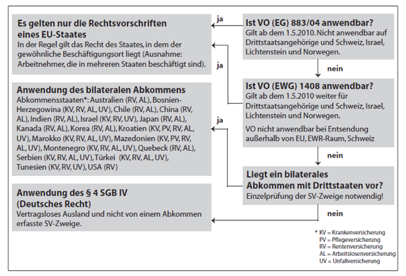 Daneben ist die Verordnung (EWG) Nr. 1408/71 vom 14.6.1971 über die Anwendung der Systeme der sozialen Sicherheit auf Arbeitnehmer und Selbständige sowie deren Familienangehörige, die innerhalb der Gemeinschaft zu- und abwandern,6 von Bedeutung; ihre Anwendung ist zu prüfen, wenn die Verordnung Nr. 883/2004 nicht einschlägig ist. Die Verordnung Nr. 1408/71 gilt für die Bereiche Krankenversicherung, Arbeitslosengeld und Rente und regelt, welches Sozialversicherungsrecht bei grenzüberschreitenden Arbeitseinsätzen zur Anwendung kommt. Auch hier gilt der Grundsatz, dass das Sozialversicherungsrecht des Beschäftigungsorts anzuwenden ist (mit zahlreichen Ausnahmen und Sonderregelungen). Zur Ermittlung, welches Recht anwendbar ist, vgl. Grafik 2.