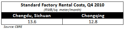 The first motivator cited by companies locating inland is quite often land cost. Prices for all types of land and facilities – residential, retail, logistics, and factory – are rising quickly in cities in all parts of the country. Chengdu and Chongqing are no exception, and standard factory rental costs as of the fourth quarter 2010 were a respective RMB13.6 and RMB12.8 per square meter per month. According to CB Richard Ellis (CBRE), inland standard factory prices have been rising between 0.5 percent and 2 percent annually over the past five years.