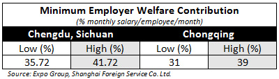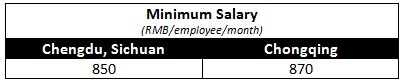 So while at first glance Chengdu appears to offer slight labor cost savings over Chongqing with regards to minimum wage, Chengdu loses this advantage by having a slightly higher minimum employer welfare contribution rate of between 35.72 percent and 41.72 percent compared to Chongqing’s range of between 31 percent and 39 percent.
