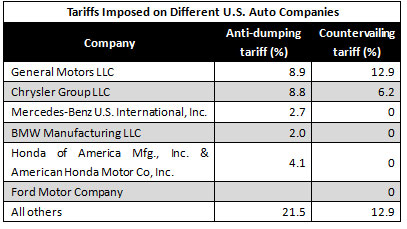 Duties imposed on U.S. auto manufacturers will depend on the amount of subsidies the respective auto manufacturers receive from the U.S. government and will vary between 2 percent and 21.5 percent.
