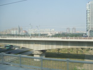 Ich schaue rechts aus dem Fenster und sehe auf die Baustelle der Neubaustrecke Peking-Shanghai. Die Gleise liegen schon, gerade wird die noch kupferrote Oberleitung eingehängt. Die Reisedauer soll sich mit dieser neuen Verbindung im Jahr 2011 von ungefähr 10:30 Stunden auf unter 4 Stunden verkürzen. Die Durchschnittsgeschwindigkeit auf der 1318 km langen Strecke beträgt 329 km/h. In diesem Moment fängt der Zug an zu bremsen. „The next stop is Kunshan South. Please get ready for your arrival“, klingt es aus dem Lautsprecher.