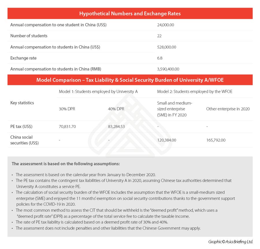 As the table shows above, if the Chinese students were hired directly by University A and University A paid annual compensation of US$528,000 to 22 Chinese students, the potential PE tax for University would range from US$70,832 to US$83,285 in 2020. If the Chinese students were hired by University A’s WFOE in China, the PE tax liability would be avoided, but the Chinese students and the WFOE will both be required to contribute to Chinese social security, which would range from US$120,384 to US$165,792. In practice, although the social security is usually paid by the WFOE, the WFOE can pass the social security burden to University A.