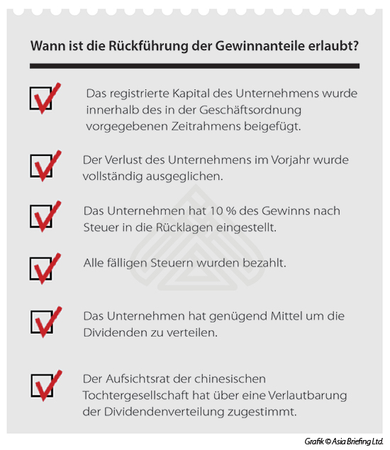 Es existieren verschiedene Wege um Gewinne aus China zurückzuführen; der offensichtlichste davon ist, dass die Tochtergesellschaft Dividenden direkt an die ausländische Muttergesellschaft überweist. Nur Profite, die in der jährlichen Abschlussprüfung erklärt wurden, können rückgeführt werden. Die jährliche Buchprüfung durch die lokalen Steuerbehörden werden normalerweise im Juni jeden Jahres abgeschlossen (siehe Zeitleiste unten). Diese Prüfung erlaubt es der staatlichen Steuerverwaltung (State Administration of Taxation – SAT) sicherzustellen, dass auf die auszuschüttenden Gewinne auch die fällige Unternehmensteuer erhoben wurde. Außerdem können keine Gewinne ins Ausland überführt werden, solange die Verluste der vorhergehenden fünf Jahre nicht ausgeglichen wurden. Die gesamte Überschussrechnung des Unternehmens muss also im Plus sein, um Profite überführen zu können. Die Steuerbehörden werden dann anhand des prozentualen Bilanzgewinns feststellen, wie viel der Gewinne ein Unternehmen ins Ausland überführen darf.