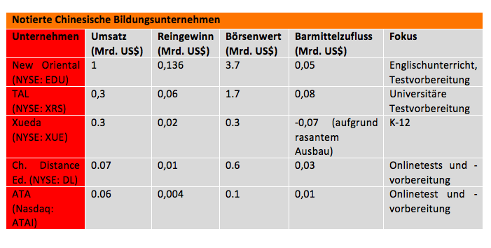 In der jüngeren Vergangenheit haben sich einige K-12-Firmen für eine Notierung an der New Yorker Börse entschieden. In den letzten drei Jahren haben die Aktienkurse als Resultat des Zynismus von Investoren bezüglich der Intransparenz des Buchhaltungswesens, wie die meisten der im Ausland notierten chinesischen Kurse, stark nachgegeben. Im letzten Jahr hat sich jedoch das Interesse der Investoren an diesen Kursen revitalisiert. Anfang 2014 hat sich der Kurswert dieses Kurssegments im Vergleich zu den Tiefpunkten der zwei vorigen Jahre verdreifacht. Bis Mitte Mai sind die Kurse wiederrum um 20 % gefallen, werden aber dennoch zu großzügigen Kursgewinnverhältnissen gehandelt (20-30x).
