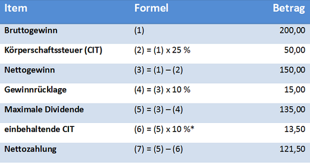 * Sollte ein Doppelbesteuerungsabkommen (DBA) bestehen und ist das Mutterunternehmen der gewinntragende Eigentümer, dann wird eine Vorwegausschüttung mit einem Körperschaftsteuersatz von 5 % besteuert.