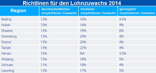 SHANGHAI – Bereits 10 Provinzen haben ihre offiziellen „Richtlinien über den Lohnzuwachs” für 2014 veröffentlicht. Die Rede ist von Beijing, Tianjin, Hubei, Shadong, Shanxi, Shaanxi, Henan, Xinjiang, Sichuan und Liaoning. In China werden diese Richtlinien durch die jeweiligen Landesbehörden veröffentlicht undsprechen eine Empfehlung für Unternehmen hinsichtlich Lohnerhöhungen auf Basis des regionalen BIPs, Arbeitsmarkts sowie weiteren soziökonomischen Bedingungen aus.