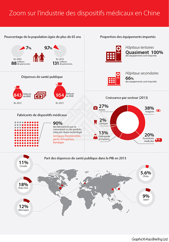 La Chine est actuellement l’un des marchés les plus prometteurs pour les équipements médicaux. Les ventes dans ce secteur ont atteint 200 milliards de RMB (près de 30 milliards d’euros) en 2013, faisant de la Chine le deuxième plus grand marché mondial selon le Service Commercial des Etats-Unis. En comparaison avec d’autres secteurs, le marché des dispositifs médicaux reste l’un de ceux enregistrant la croissance la plus rapide dans le pays.